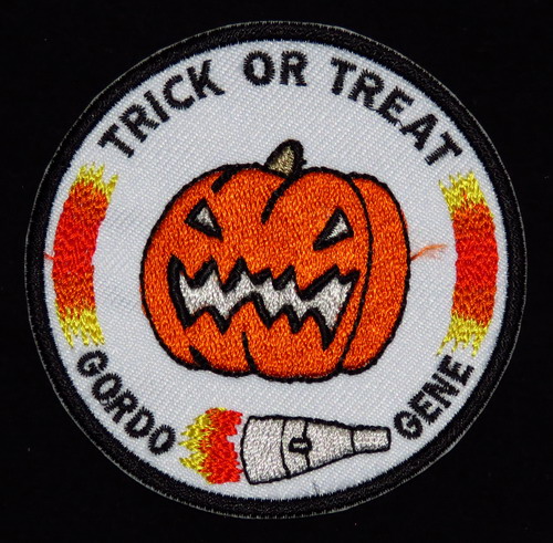 Badge de l'équipage doublure de Gemini-12. ![]() Autour de la citrouille de Halloween figurent un vaisseau Gemini, les prénoms des doublures (Gordo Cooper et Gene Cernan) et surtout le slogan de Halloween "Trick or treat", qui peut se traduire par "une friandise ou un mauvais sort": C'est ce qu'annoncent les petits américains (déguisés en sorcières ou autres monstres) en sonnant aux portes et en demandant des friandises...sinon gare aux représailles ! |