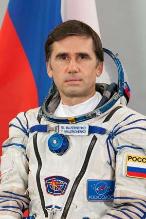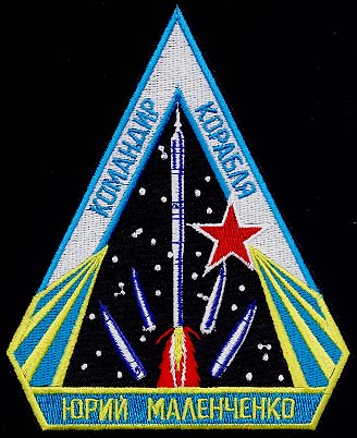 Youri MALENCHENKO. Il a volé sur Soyouz TM-19 . Sur le badge, une fusée Soyouz largue des