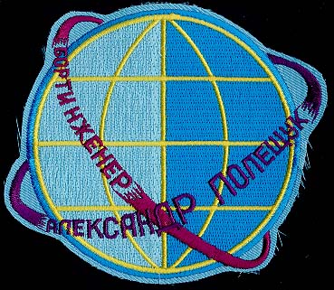 Le badge représente le globe terrestre avec deux inscriptions en orbite: le nom du cosmonaute et son titre d'ingénieur de bord.