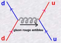 L'interaction forte s'exerce par l'intermédiaire d'un boson ou particule médiatrice. Ce boson a été baptisé gluon et il en existe huit différents; chacun porteur d'une couleur et d'une anticouleur.