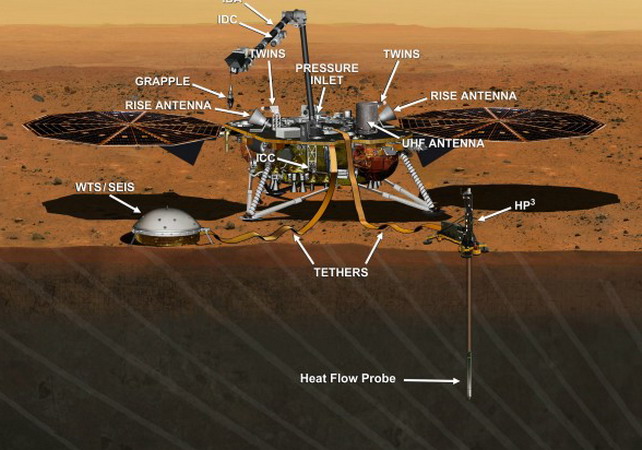 sismomètre SEIS, et un instrument HP3 de mesure des flux de