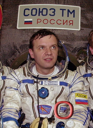 porté le badge Rossaviacosmos en octobre 2000. On le voit, à gauche, à l'entrainement. A droite, il porte ce badge au décollage sur son scaphandre. Ce sera le premier vol vers l'ISS Expedition-1. ![]() |