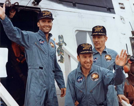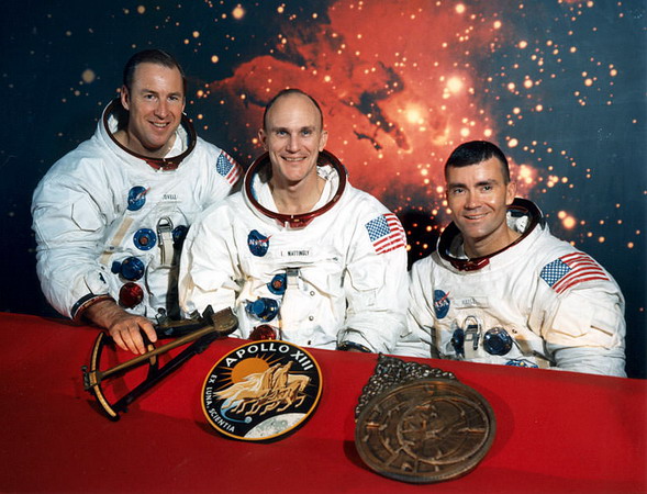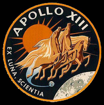 Mission du 11 au 17 Avril 1970. Echec de la mission: L'explosion d'un réservoir d'oxygène pendant le vol vers la Lune a failli provoquer une catastrophe. L'équipage réussit à regagner la Terre de justesse grâce au module lunaire Aquarius. C'est un artiste de New-York, Lumen Winter, qui dessina le badge d'après une idée de base de l'astronaute James Lovell. Equipage: -