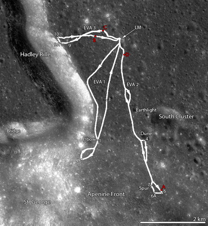 Apollo 15 est la première mission faisant intervenir le rover lunaire, parcourant 27,9 kilomètres. Le rover fut très pratique comme outil d’exploration et pour transporter des échantillons et l’équipage, avant d’être finalement abandonné sur la Lune.