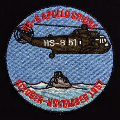 ![]() badge commémoratif de l'escadron des hélicoptères HS-8 (HS pour Helicopter anti-Submarine) qui participa à la récupération de la capsule Apollo IV. |