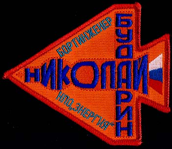 Nikolaï BOUDARINE. Il a volé sur STS-71 (Mir EO-19) et Soyouz TM-27. Le badge contient un vaisseau Soyouz avec en bleu foncé le nom et le prénom du cosmonaute. Son titre d'ingénieur de vol figure en haut en bleu clair et le nom de la société NPO-ENERGIA figure en bas en bleu clair. |