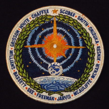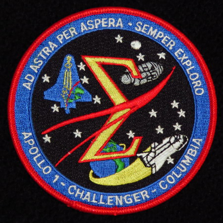 Badge en hommage aux astronautes US décédés lors des accidents d'Apollo-1 et des Navettes Challenger (STS-51L) et Columbia (STS-107).
