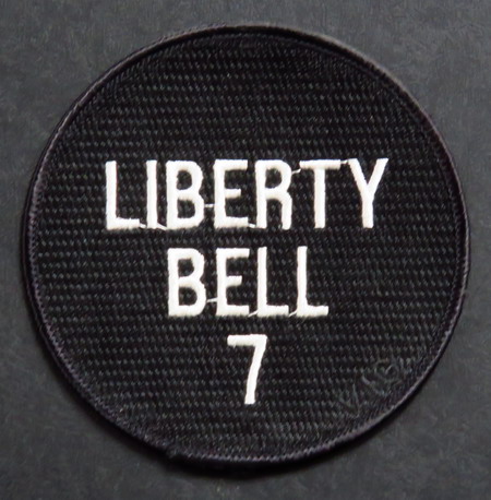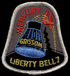 Deux Badges souvenir de Mercury-4: Ce premier badge reproduit, avec fidélité, l'inscription blanche figurant sur la capsule: le nom Liberty Bell 7 (Cloche de la Liberté) attribué à la capsule Mercury-4. Remarquez sur le bord (en bas à droite) les initiales (brodées en noir) de l'astronaute: VIG pour Virgil Ivan GRISSOM. La fêlure de la "Cloche de la Liberté" était reproduite en peinture blanche à gauche de l'inscription "Liberty Bell 7" ![]() |