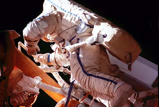Mir le 12 Février 1997 avec Soyouz TM-25. Mir est déjà occupée par l'américain Jerry LINENGER qui restera avec les 2 cosmonautes