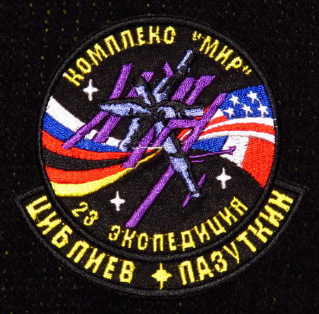 Badge prévu à l'origine pour la mission Mir-23 avec le nom des 2 cosmonautes russes Tsibliev et Lazoutkine qui ont décollé et atterri avec Soyouz TM-25