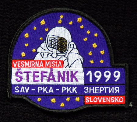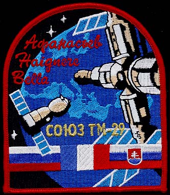Le 20 Février 1999, l'équipage de Soyouz TM-29 rejoint le complexe Mir (déjà occupée par Padalka et Avdeyev) pour ce qui devait être la dernière mission de Mir. Jean Paul Haignere réalisera le séjour record d'un cosmonaute européen: 188 jours dans le cosmos. Le badge représente les drapeaux des 3 nations ayant participé à ce vol. |