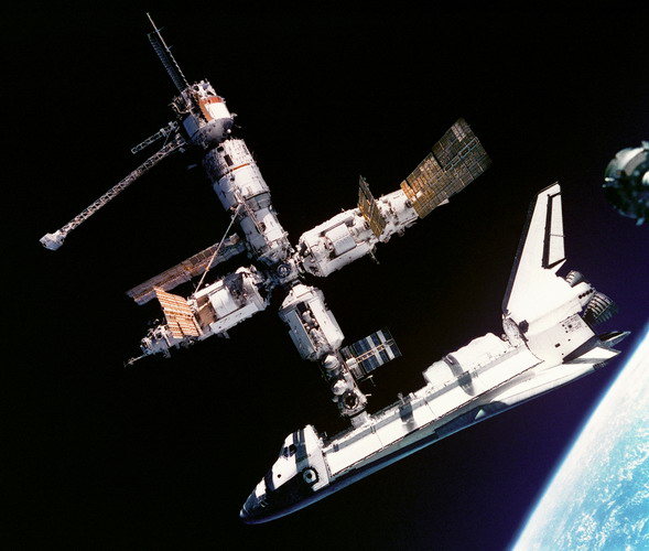 (1995: Premier amarrage Mir-Navette avec transfert de Soloviev et Boudarine de Navette sur Mir) |