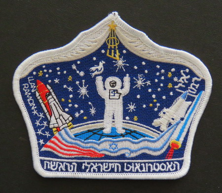Badge souvenir d'Ilan RAMON Le colonel Ilan Ramon, premier astronaute israélien, a conçu ce patch personnellement. Lors de sa dernière visite en Israël, il a commandé ce badge. Il montre un astronaute avec une colombe de la paix, le lancement de la navette Columbus à gauche, son avion de chasse F16 (avec lequel il a bombardé le réacteur nucléaire irakien en 1980) à droite. Les drapeaux des États-Unis et d'Israël sont combinés ensemble. Côté gauche du badge: son nom en anglais; côté droit son nom en hébreu. En bas l'inscription hébraïque: premier astronaute israélien. ![]() |