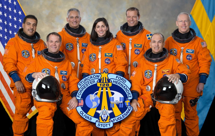 station ISS. Les noms des membres de l'équipage du STS-128 bordent le badge comme un ruban;. En haut du badge figurent les noms du membre d'équipage qui débarquera de STS-128 et restera à bord de l'ISS, remplaçant un autre membre d'équipage d'expédition qui rentrera chez lui avec STS-128. La bannière complète également le symbole du Corps des astronautes et contient les drapeaux américains et suédois représentant les pays de l'équipage du STS-128. |
