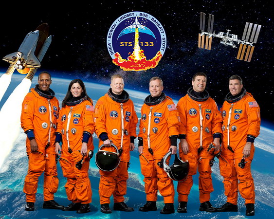 station ISS. Le patch de la mission STS-133 est basé sur des croquis du défunt artiste Robert McCall; ce sont les dernières créations de sa longue et prodigieuse carrière. |