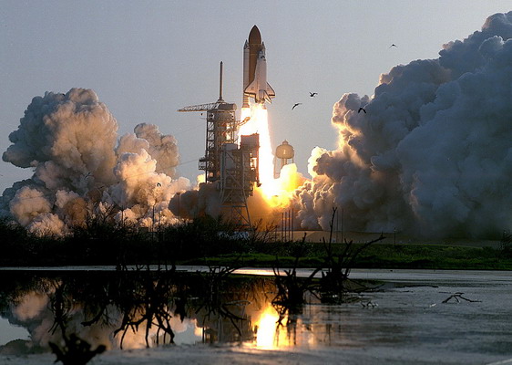 Le badge superpose l'aigle américain et la Navette à l'avion primitif des frères Wright: ceci illustre les avancées rapides de l'aéronautique américaine.