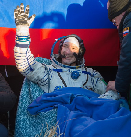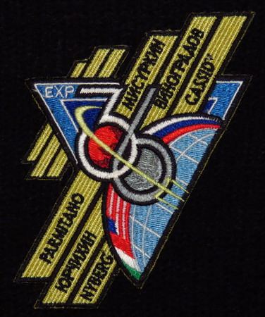 Le Russe YURCHIKHIN, l'Américaine NYBERG et l'Italien PARMITANO reviendront sur Terre après un séjour de 166 jours à bord de la station. La bordure interne bleue du badge imite la bordure métallique de l'écran du périscope VIZIR (flèche N°7 de la photo)