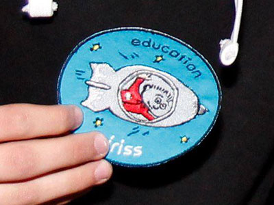 La mission Iriss comprend deux badges, un pour illustrer la mission dans son ensemble et un autre pour le programme éducatif. Cet écusson de Andreas Mogensen a été réalisé et embarqué dans l'ISS pour mettre en évidence le programme éducatif danois destiné à inspirer les jeunes lors de sa mission de 10 jours en 2015. Le logo éducatif de Mogensen a été conçu par Louise Nielsen, âgée de 19 ans, qui a adopté les mêmes couleurs que le logo de la mission, mais le dessin montre un Andreas de style cartoon se dirigeant vers l'espace dans une fusée. |