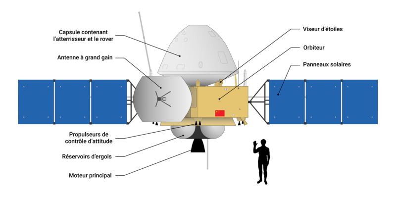 Tianwen-1 (chinois : 天问一号, traduction littérale de « Question au ciel ») est une sonde spatiale martienne de l'agence spatiale chinoise (CNSA) développée et construite par la CASC, le principal industriel chinois du secteur spatial. La sonde consiste en un orbiteur, un atterrisseur et un astromobile (rover) qui doit explorer la surface de la planète. La mission décolle avec succès le depuis le centre spatial de Wenchang situé sur l'île d'Hainan à bord du cinquième exemplaire du lanceur lourd Longue Marche 5. La sonde spatiale doit se placer en orbite autour de Mars en . Après une phase de reconnaissance d'une durée 2 mois durant laquelle le site d'atterrissage est étudié, la capsule de rentrée se détachera de l'orbiteur en pour effectuer une rentrée atmosphérique. Une fois la vitesse de descente suffisamment réduite, l'atterrisseur utilisera sa propulsion pour annuler la vitesse résiduelle et se poser en douceur sur Mars, puis déposera le rover à la surface de la planète. L'orbiteur servira de relais de télécommunications pendant la mission primaire du rover puis se placera dans une orbite plus propice aux observations tout en conservant son rôle de relais. Ce badge présente la puissante fusée chinoise "Longue Marche 5" (ou CZ-5 qui vient de Chang Zheng 5, du chinois: 长征五号) A gauche, le lancement depuis la Terre et l'île de Hainan avec la date du 23.07.2020 A droite, la mise en orbite martienne de Tianwen prévue en Février 2021. |