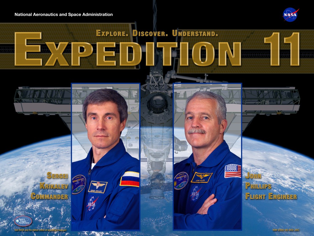 L'emblème de la onzième expédition à destination de la Station spatiale internationale (ISS) souligne le rôle des États-Unis et de la Fédération de Russie dans le partenariat multinational de l'ISS. Les deux panaches de fusée, à la manière des drapeaux de ces deux nations, représentent les véhicules russes Soyouz et les navettes spatiales américaines. L'image de l'ISS montre la configuration de la station en orbite au début de l'expédition, avec les véhicules amarrés Soyuz et Progress et les énormes panneaux solaires américains. Les noms des deux membres de l’équipage sont indiqués en marge du badge. Le commandant de l'ISS, Sergei Krikalev, et John Phillips, officier scientifique et ingénieur de vol de la NASA pour l'ISS, devraient décoller avec un véhicule Soyouz et être en orbite lors de la reprise des vols de la navette spatiale (après l'accident de STS-107). L’équipage explique: «La Terre bleue et verte avec la Station spatiale en orbite au-dessus de la Terre, ainsi que les étoiles brillantes, le ciel sombre et le soleil éclatant, témoignent de la beauté de notre planète et des contrastes saisissants de l’environnement spatial. (Source NASA) Création de Tim GAGNON: son premier badge! À l'origine, il y avait trois membres d'équipage. Krikalev et Phillips devaient partir dans le Soyuz et Serguei Volkov à bord de la navette. Mais à la reprise des vols navette après l'accident de Columbia, la mission STS-114 a été reportée et donc le planning d'Expédition-11 a été modifié et réduit à 2 cosmonautes. Sur le badge, le nom de Volkov a été remplacé par un ′′ Soleil ": En tant que fils de cosmonaute (Sergueï est le fils d'Alexandre), il plaisantait et disait que le Soleil le représentait. ![]() C'est pourquoi le ′′11′′ est formé par deux trainées de flammes de lancement différents (une trainée devait être celle de la navette). Krikalev a demandé une trainée de drapeau russe avec un rendu stylisé de la lettre grecque ′′Alpha.". En effet, Krikalev était membre de la première Expédition et a alors demandé d'utiliser le code radio "Alpha" pour la station ISS. ( Source: Tim Gagnon ) Décollage le 15 Avril 2005 avec