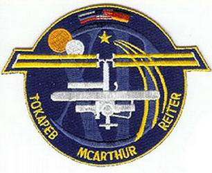 McArthur et Tokarev. Finalement, Reiter sera remplacé par le "touriste" Olsen à bord de Soyouz TMA-7. Reiter participera plus tard à l'Expedition suivante: la numéro 13. ce badge avec fond bleu qui a été porté par le Russe Tokarev. |