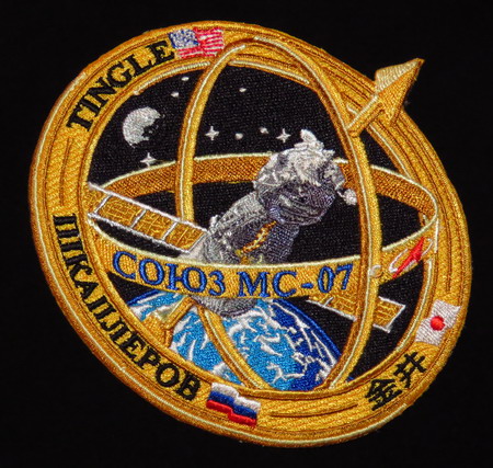 A noter, sur ce badge, le nom du cosmonaute VAGNER (ecrit en russe au-dessus de TINGLE) qui sera éliminé de ce projet de mission, comme il l'a été (éliminé) du projet initial de l'Expédition 54 (voir le badge annulé avec son nom!). |