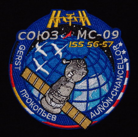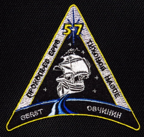 Equipage involontairement réduit à 3 cosmonautes (dont l'Allemand GERST) pendant la plus grande partie de la mission, suite à l'incident du vol Soyouz MS-10. Le badge officiel comprend donc 3 noms, bien que l'expédition finira avec 6 cosmonautes. 4 Octobre 2018: Désamarrage de Soyouz MS-08 et début officiel de l'Expédition 57. 11