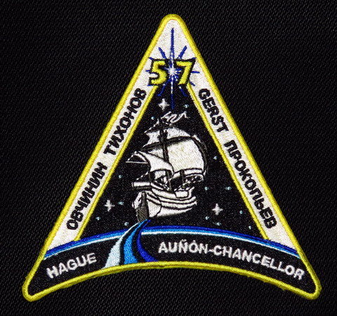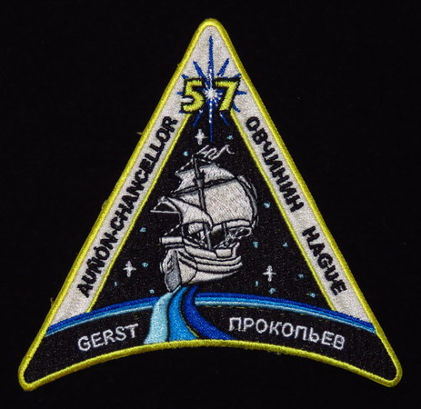 Du 4 Octobre 2018 au 20 Décembre 2018. Les humains sont des explorateurs. Nous vivons sur une île cosmique. Naviguer vers de nouveaux mondes a toujours été notre nature, et c'est la clé de notre survie. Dès que nos ancêtres ont appris à construire des navires, ils ne les ont pas seulement utilisés pour naviguer le long des côtes, mais ils ont finalement décidé de voyager au-delà de l'horizon pour découvrir de nouveaux continents. Le temps de l'exploration spatiale ne fait que commencer, un clin d'œil dans la longue histoire de l'exploration humaine. Et pourtant, nous avons déjà construit avec succès de grands navires pour naviguer dans les mers célestes noires et nous avons osé des voyages aventureux dans l'inconnu. Le badge Expedition 57 est un hommage à l'exploration humaine. Il dépeint un navire explorateur partant vers l’inconnu comme le firent nos ancêtres. Il a la forme d’une flèche et se dirige vers de nouveaux horizons cosmiques. Il souligne l’utilité de la Station spatiale internationale en tant que laboratoire scientifique de calibre mondial au service de l’humanité et de la coopération internationale; Ainsi le fleuron de l’humanité dans l’espace nous prépare aux formidables voyages à venir. Le badge Expedition 57 est dédié à tous les milliers d’êtres humains qui rendent ce voyage possible grâce à la contribution de leur passion, de leur travail assidu et de leur courage à l’un des projets les plus fascinants de l’histoire humaine. (Source NASA)