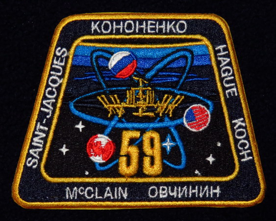 Du 15 Mars au 24 Juin 2019. Le badge Expedition 59 célèbre le rôle joué par la Station spatiale internationale en tant que laboratoire scientifique en microgravité. L'équipage, composé de scientifiques, de médecins, d'ingénieurs et de pilotes, mènera des centaines d'expériences au profit de l'humanité et de l'environnement fragile de la planète Terre.La forme du badge représente les fenêtres de la coupole. À travers elles, les astronautes ont effectué de nombreuses observations significatives des écosystèmes de la Terre. Ils ont également découvert et étudié des événements en temps réel tels que des éruptions volcaniques et des tremblements de terre. La position de la Terre au sommet du dessin indique l'endroit où la Terre serait vue par un astronaute dans la coupole. Il représente le point de vue unique des explorateurs sur leur maison. L'image au centre du dessin représente la station elle-même, la plus grande structure que l'homme ait jamais construite dans l'espace, une merveille d'ingénierie. La station est située sur un atome, la pierre angulaire de la matière. L'atome a trois orbites électroniques avec les drapeaux de la Russie, des USA et du Canada, représentant les pays d'origine de l'équipage de l'Expedition 59. À l'instar des électrons dans un atome, la coopération internationale est la force stabilisatrice qui permet l'exploration spatiale à grande échelle. Pour accomplir de grandes actions, des humains du monde entier doivent travailler ensemble dans la paix avec une vision commune. Le badge Expedition 59 célèbre les réalisations scientifiques gigantesques de la station spatiale tout en soulignant l’importance du travail d’équipe mondiale pour comprendre notre planète et poursuivre les explorations audacieuses à l’avenir. (source NASA)