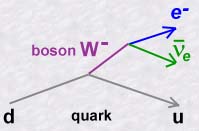 La radioactivité b- est donc expliquée par l'émission d'un boson W- par le quark d d'un neutron. Ce quark d change alors de saveur et devient un quark u. Le boson W-, qui est très instable, se matérialise rapidement en un électron et un antineutrino. Cette réaction est illustrée par la représentation de Feynman suivante:
