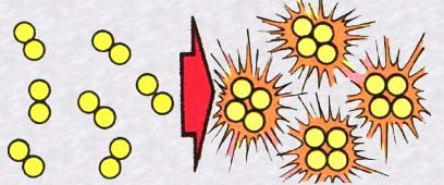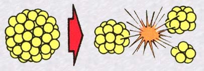 Lorsque le noyau d'un atome lourd (comme l'uranium 235) fissionne (ou se fragmente) en deux noyaux plus petits, il se produit un évènement remarquable: l'addition des masses des deux noyaux résiduels est inférieure à la masse du gros noyau d'origine. Où est donc passée cette masse manquante? Elle s'est transformée en énergie pure, (équivalence masse-énergie d'Einstein), une énorme quantité d'énergie. De plus, dans le cas de l'uranium 235, la fission du noyau peut être provoquée par un unique neutron et, détail très important, cette fission produit elle-même à son tour d'autres neutrons qui eux-même iront briser d'autres noyaux d'uranium...On assiste à une réaction en chaîne.